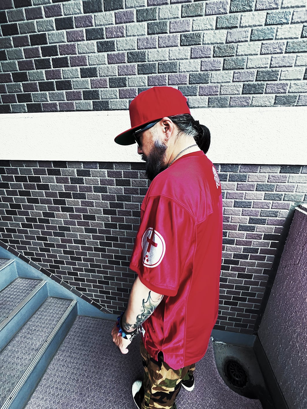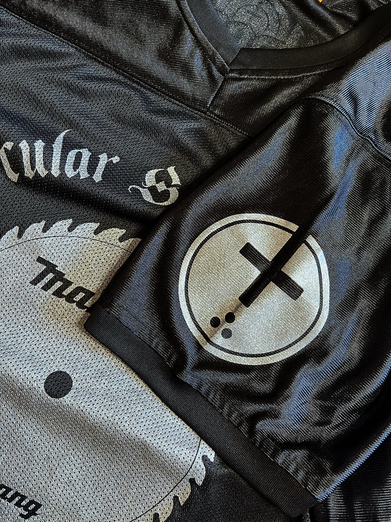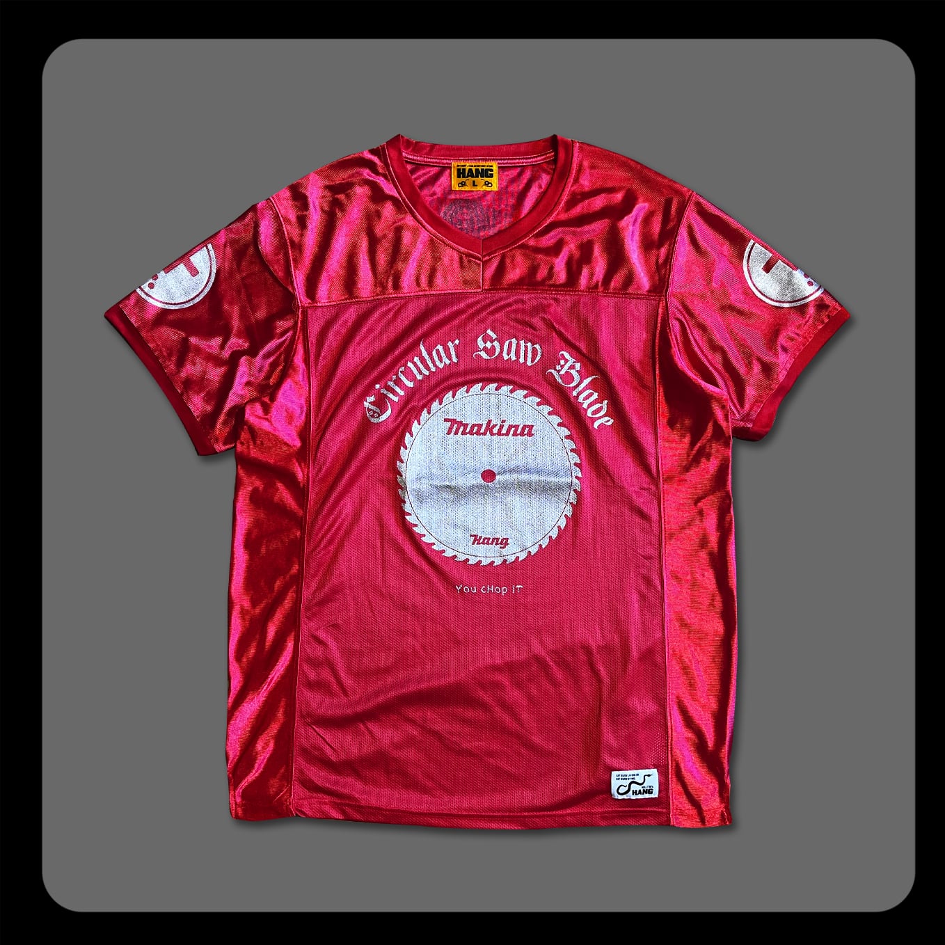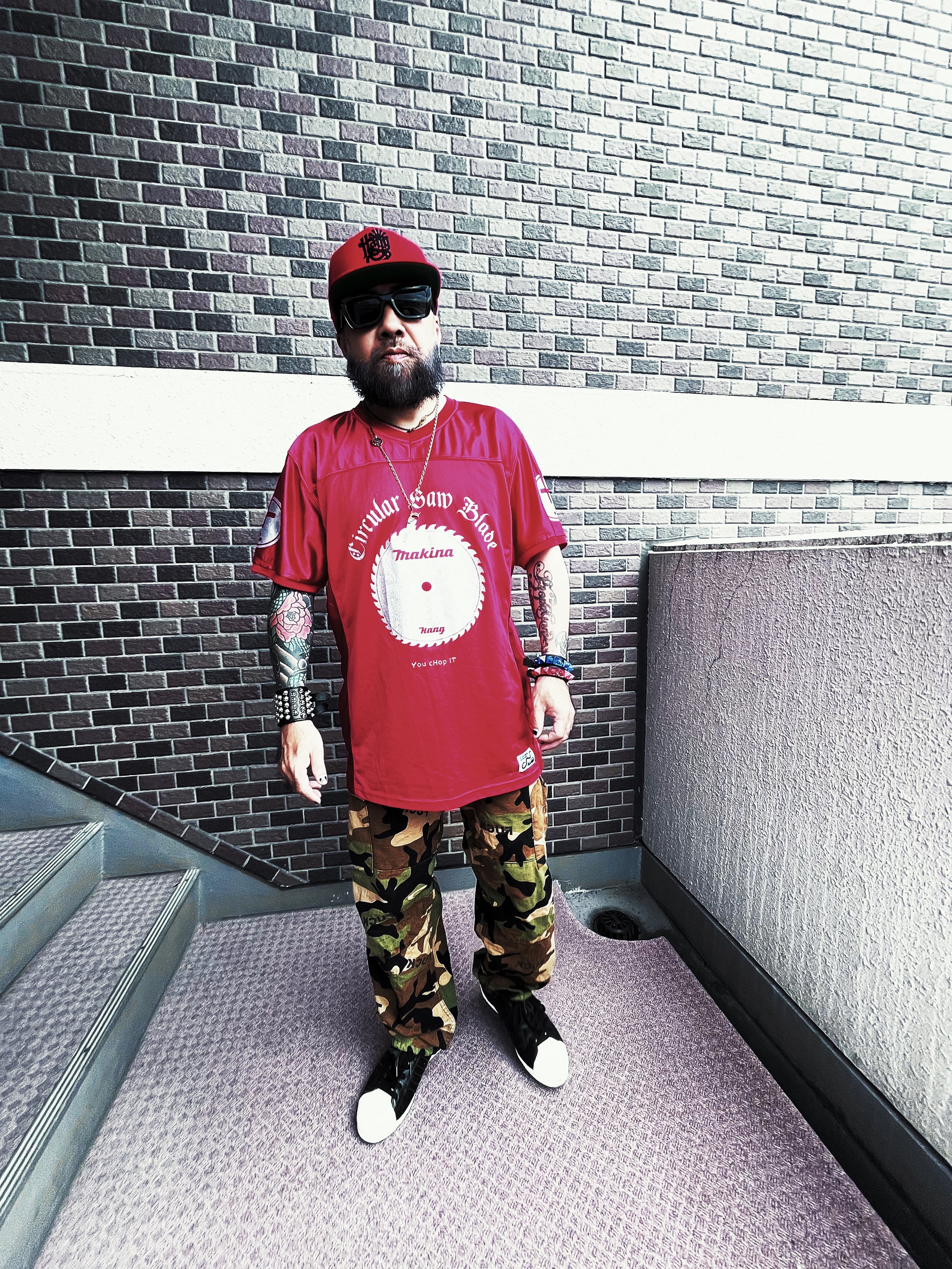 職人達の信頼の証【m◯kita】の丸鋸をHANGの刃に変え、サタニックなHANGのシンボルマークを両肩に、後方首下には、HANGロゴも鎮座。