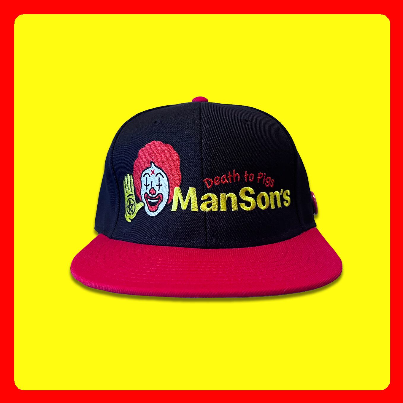 黄色と赤のツバが、ポップさと不穏さを同時に強調し、フリークでありながら強烈なユーモアを纏わせています。