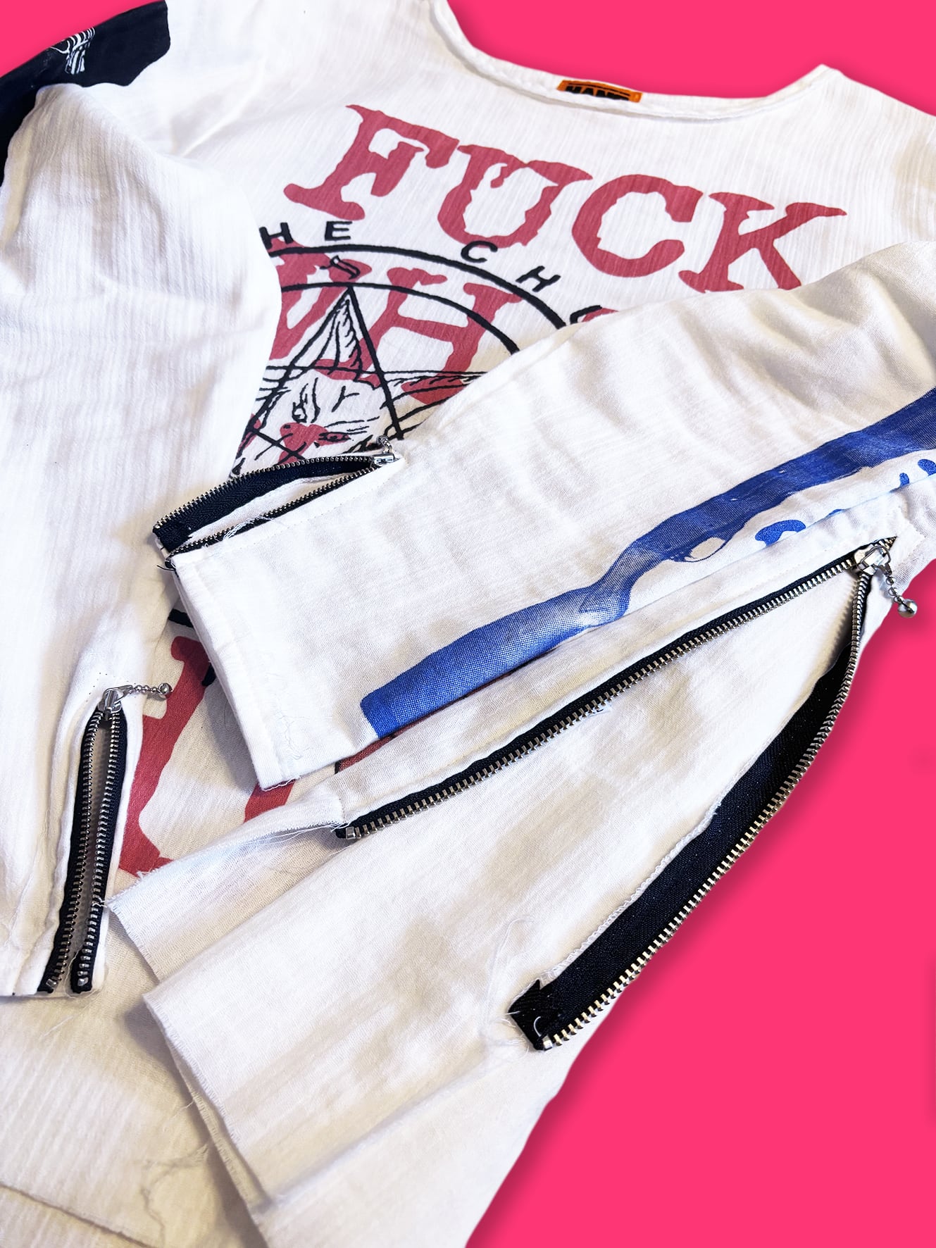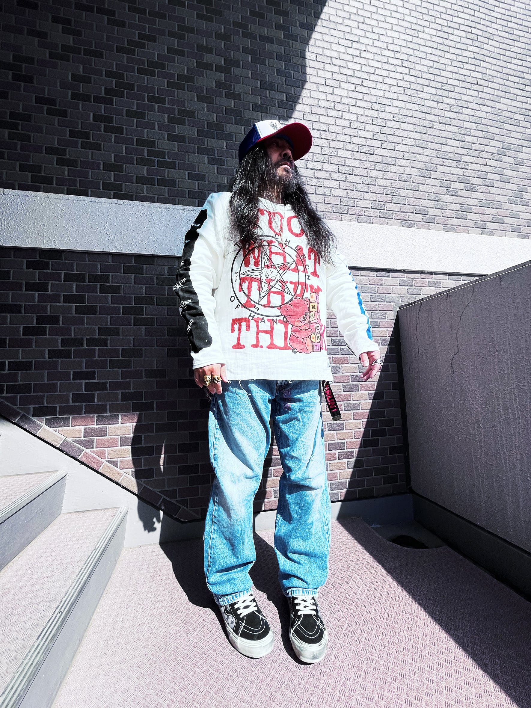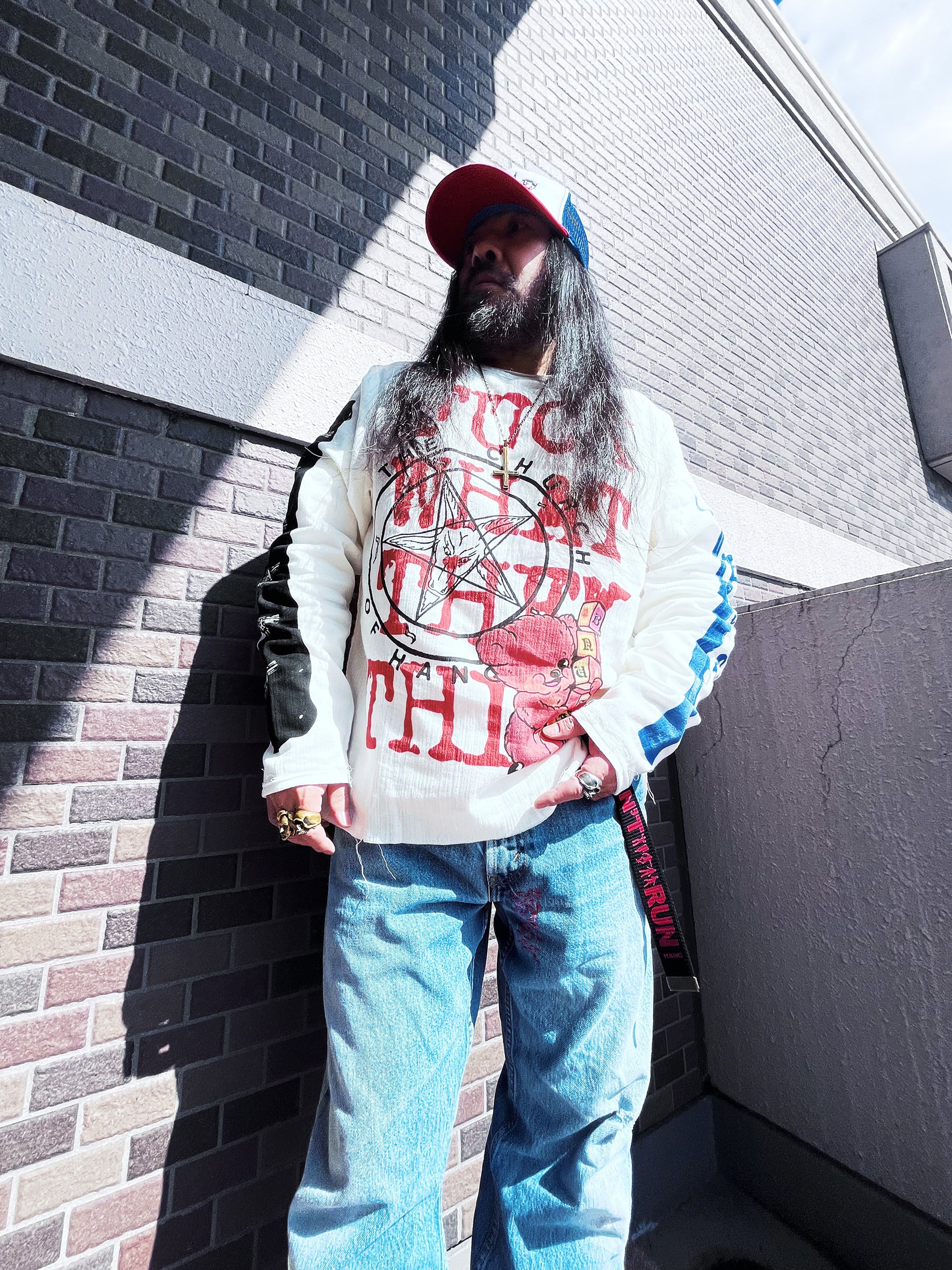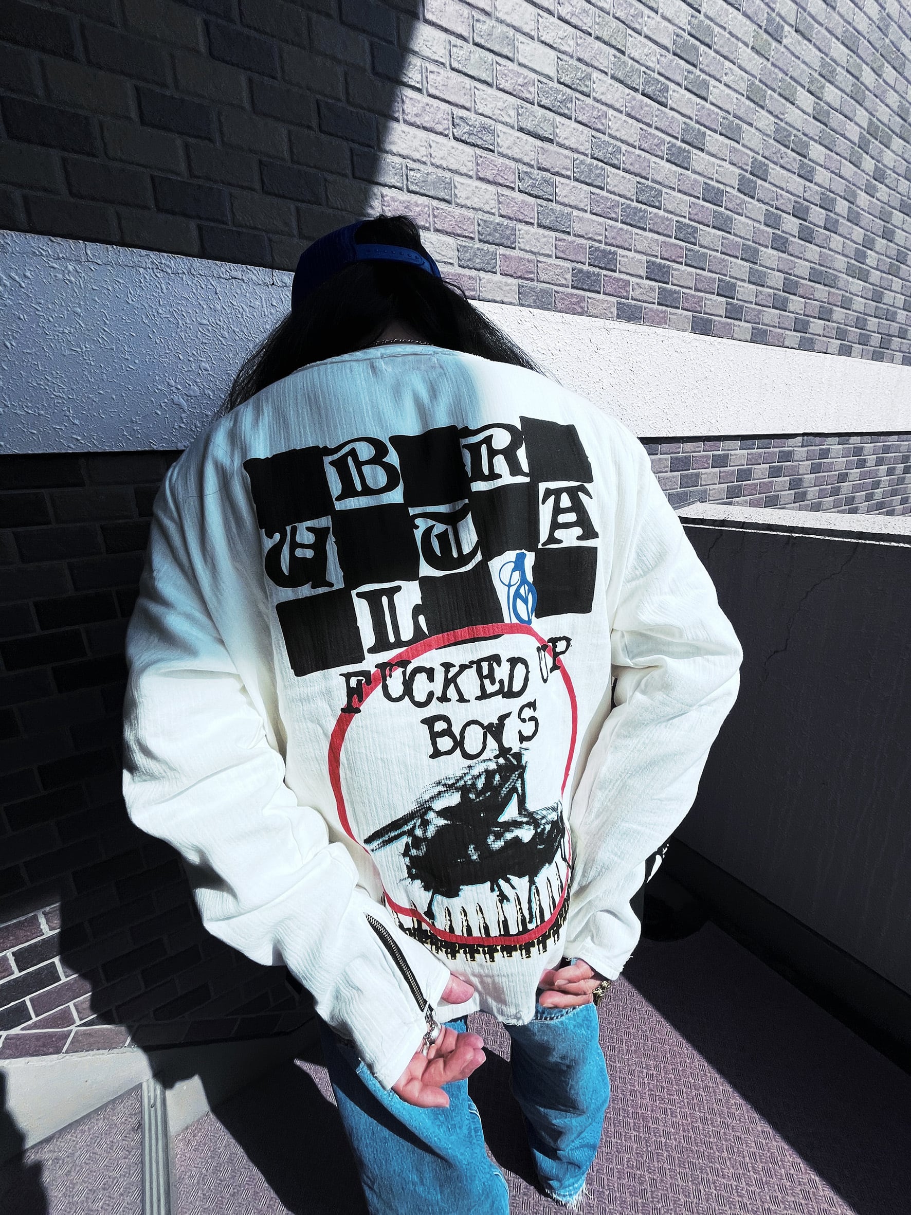“Death to Pigs”はチャールズ・マンソンの言葉。バックには「BRUTAL / FUCKED UP BOYS」、FUCKしてるハエと弾丸ベルトのモチーフ。袖口ジップ、裾カットオフ仕様。