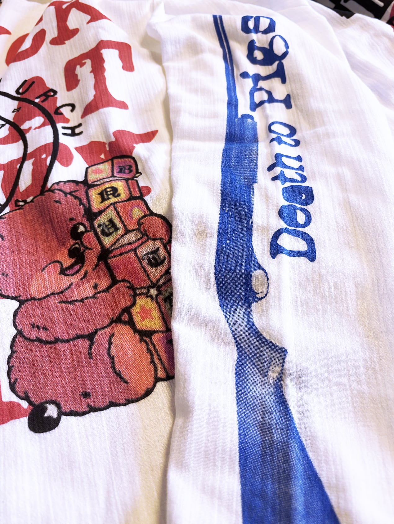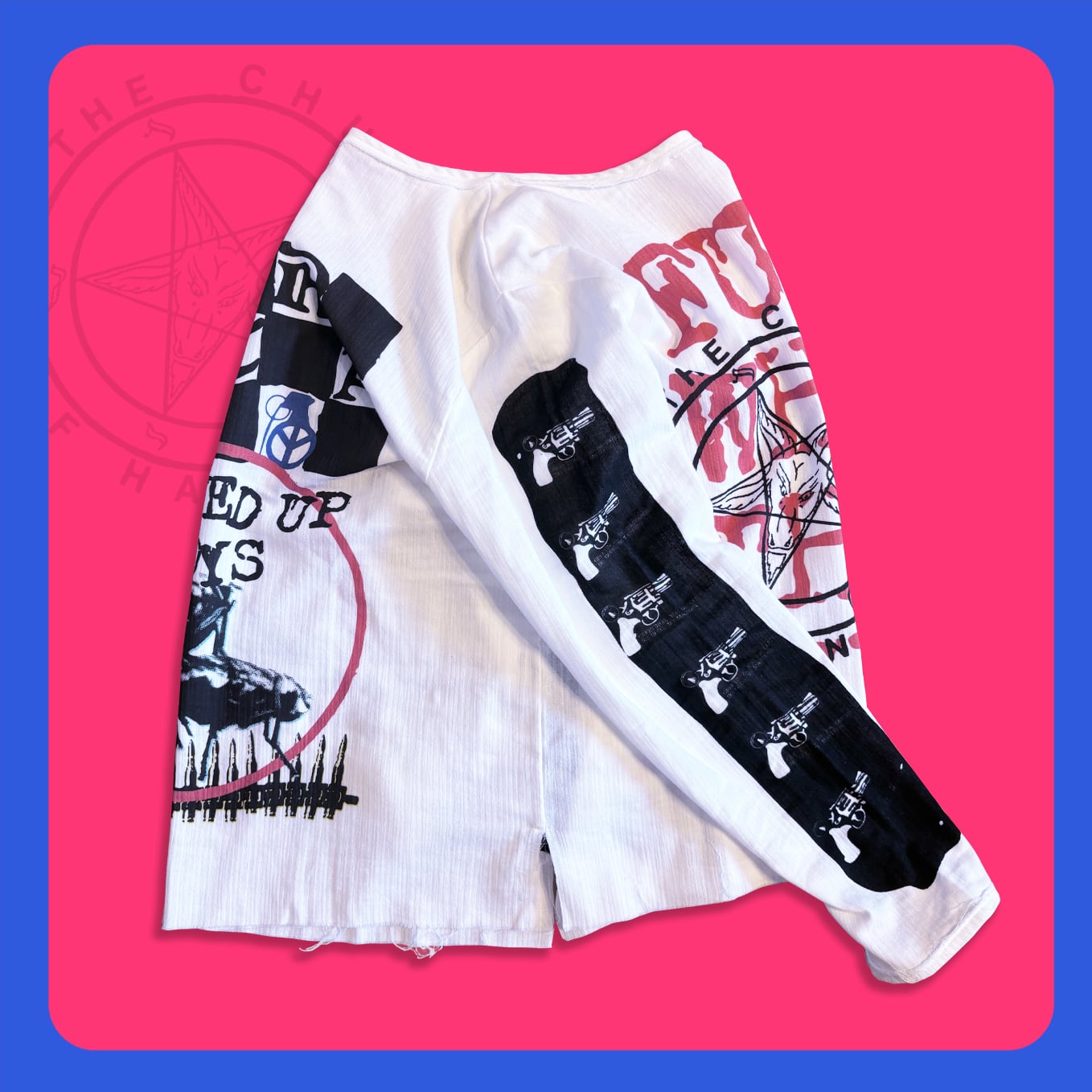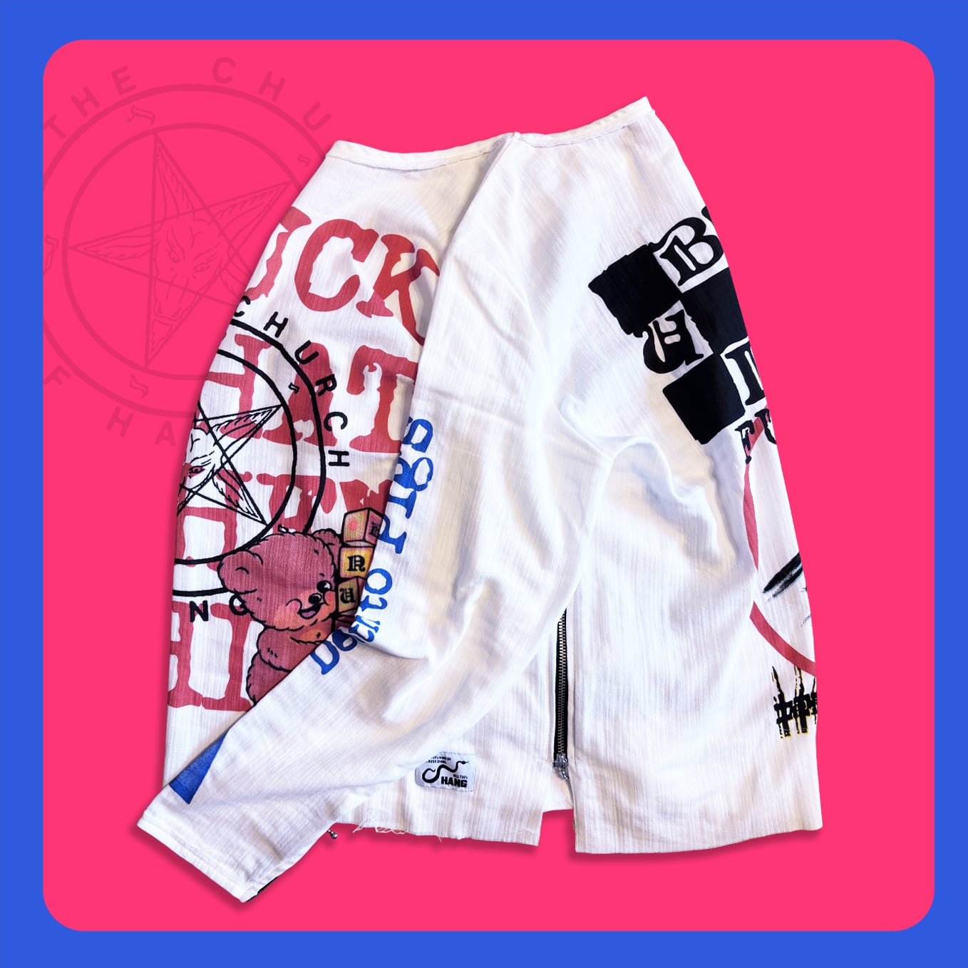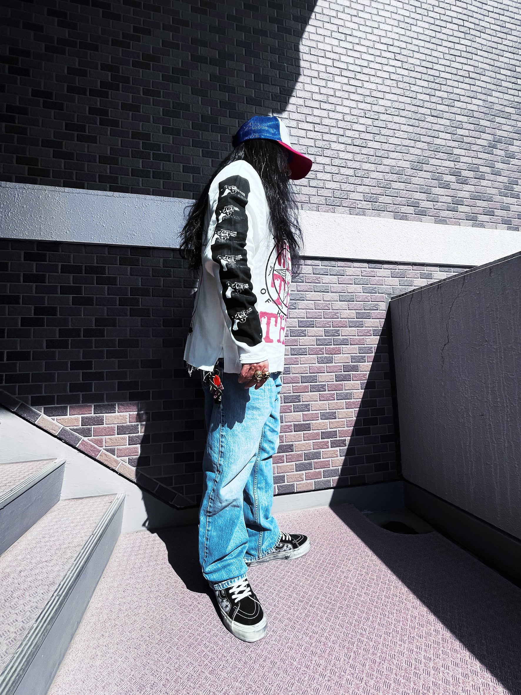 “Death to Pigs”はチャールズ・マンソンの言葉。バックには「BRUTAL / FUCKED UP BOYS」、FUCKしてるハエと弾丸ベルトのモチーフ。袖口ジップ、裾カットオフ仕様。