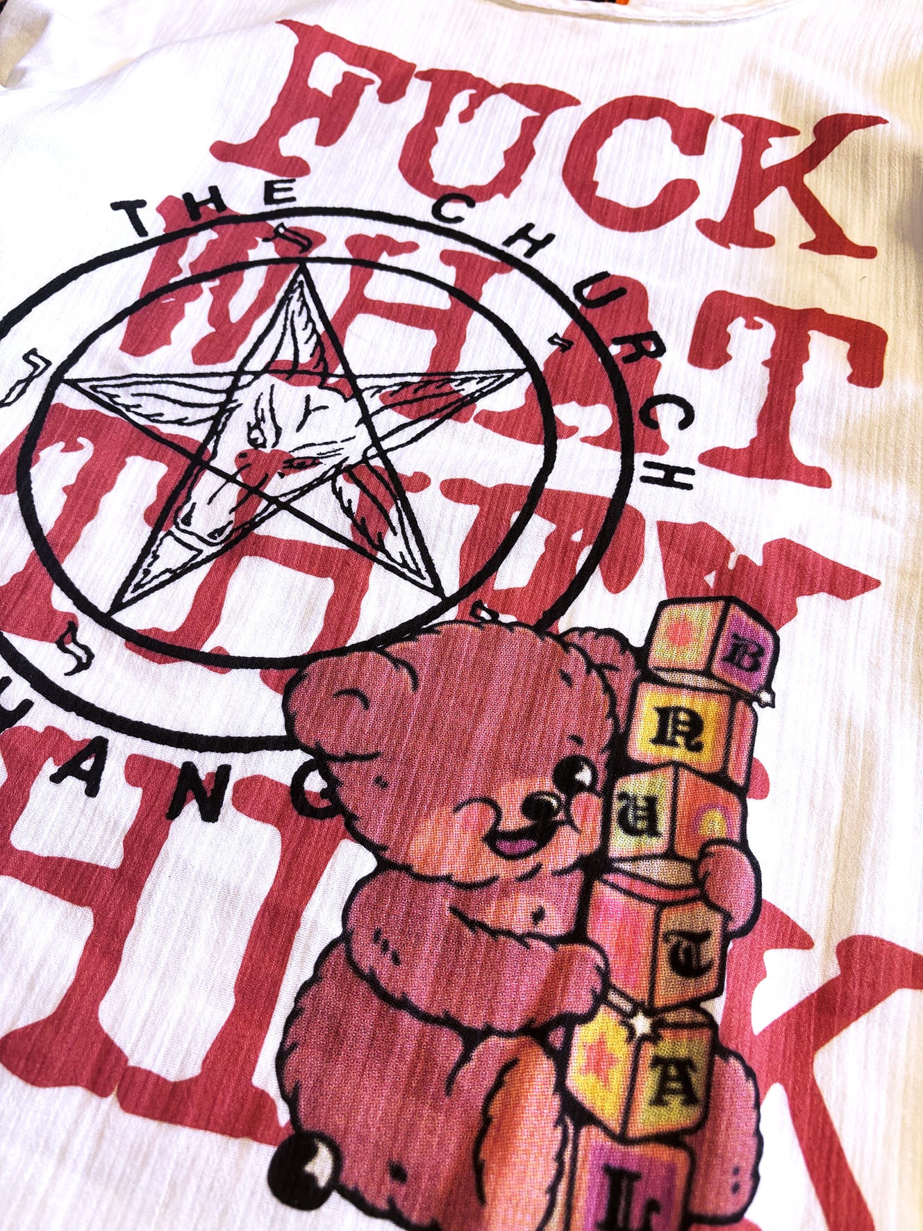 「THE CHURCH OF HANG」と五芒星、BRUTALブロックを抱えたベアのグラフィックメッセージ。