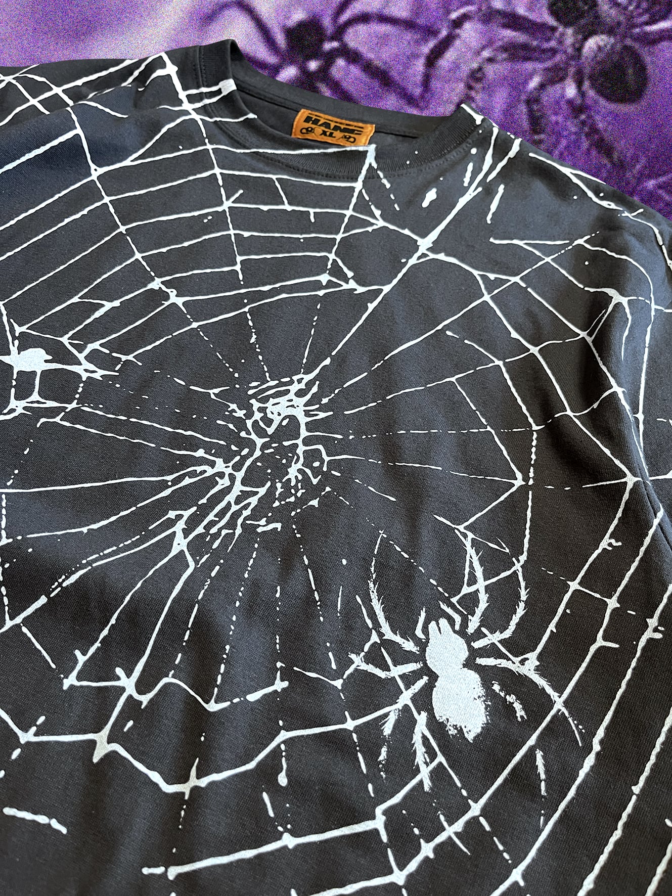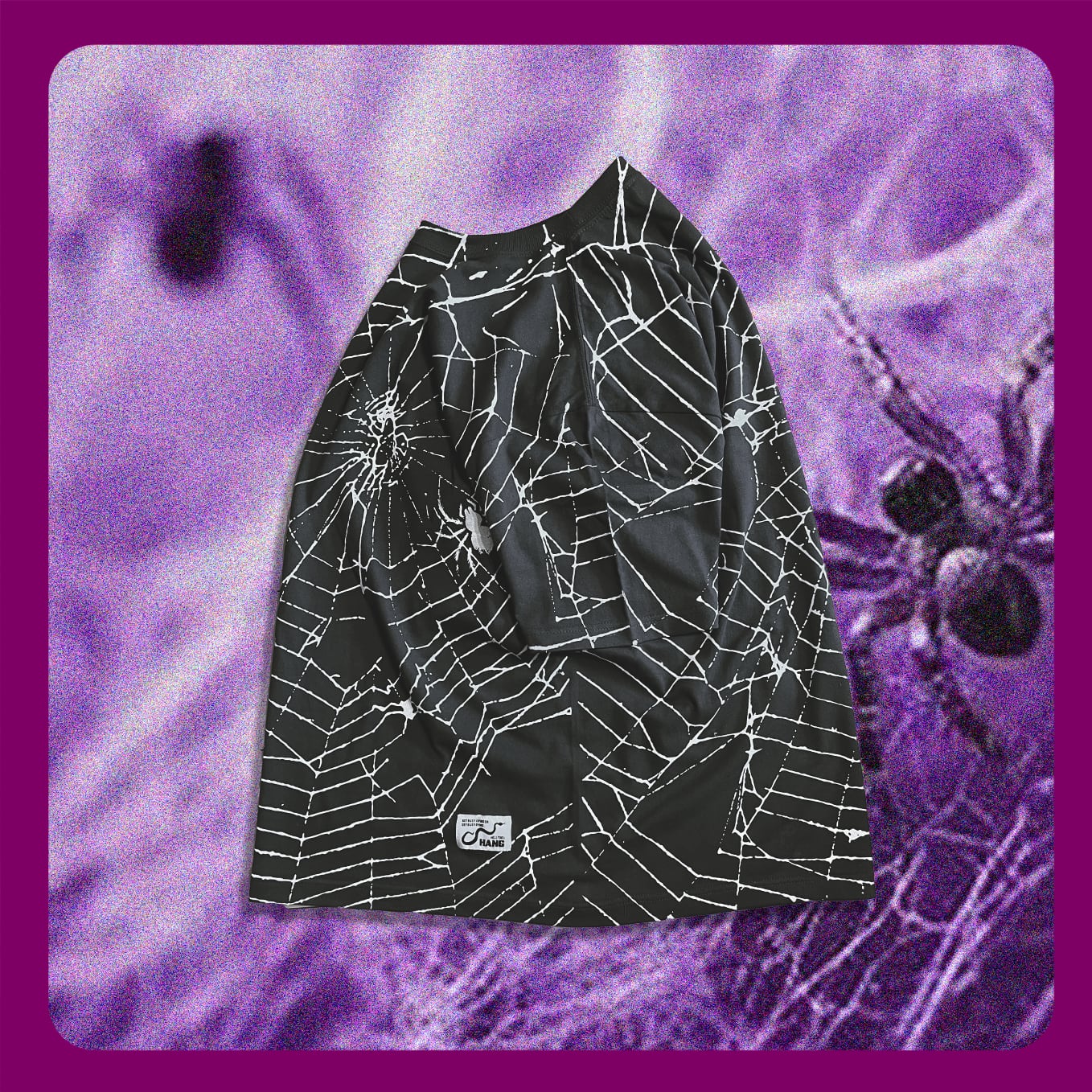 全面に大胆にプリントされた蜘蛛の巣は、フロントから袖、
