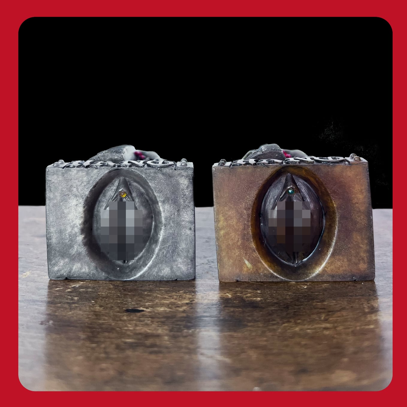 スタチューの台座裏には、精巧な女性器の彫刻が施されており、さらにそのクリトリス部分には、一粒のラインストーンがはめ込まれています。